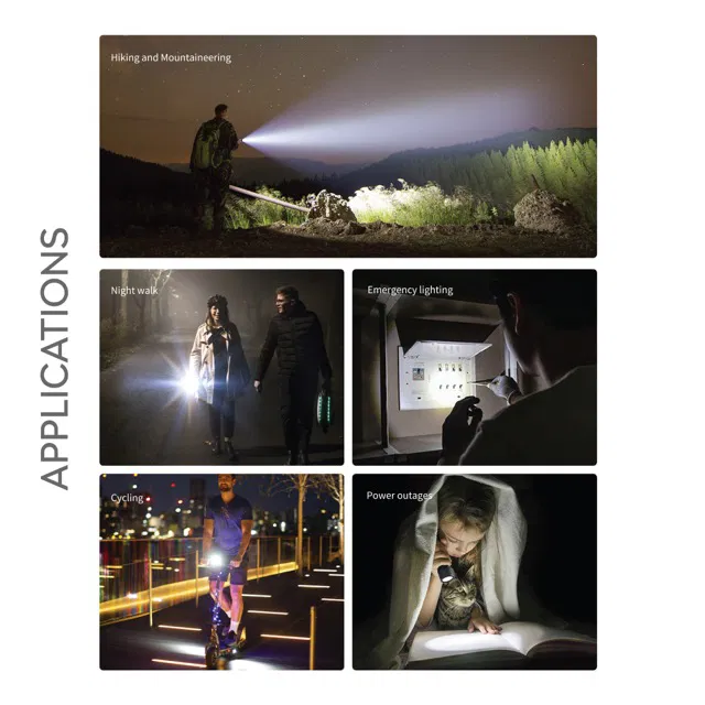 • The torch is powered by a 3500mAh, 21700*1 Li-ion battery, providing up to 246 minutes of running time on strong mode and a charging time of about 4 hours with a 5V 1A USB Type-C connection.